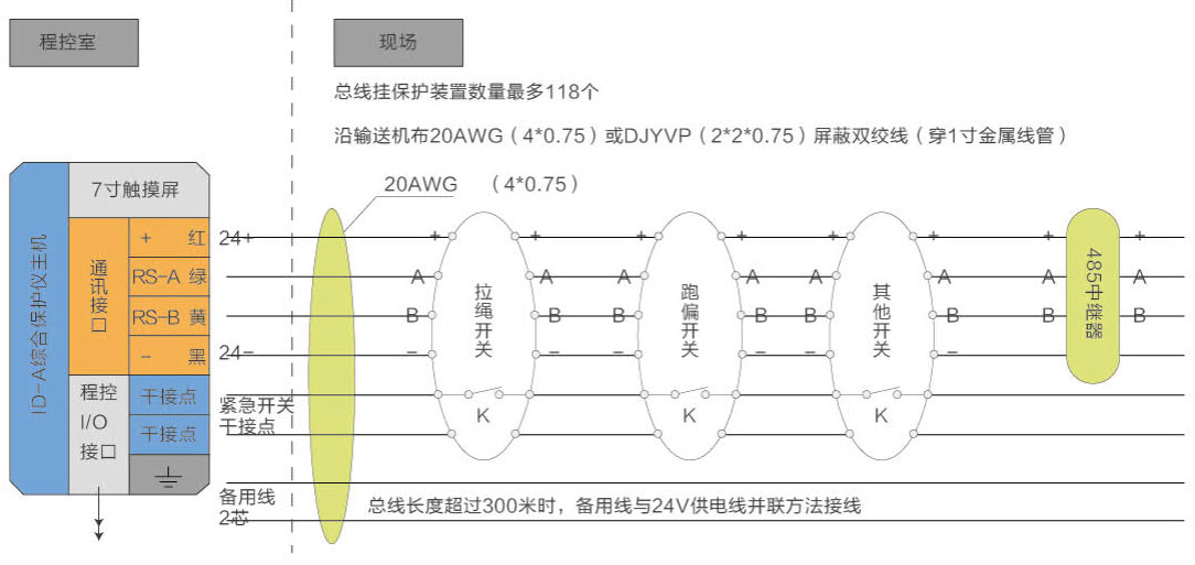 智能编码系统由控制箱(简称主机)、信号中继器及配有地址编码终端模块的保护装置组成。系统网络采用RS-485总线制结构,双绞线或光缆连接,MODBUS-RTU通信协议传输信号(超长距离的信号传输可选用新型的级联式CWDM光缆的传输方式)。主机通过RS-485总线监视现场各种保护装置终端,当保护装置开关动作时,主机能直接显示准确的地址,缩短了输送设备排队故障和停机时间。同时向输送程控系统DCS上传解析后的485信号。装置适应输送设备现场面临的极限温度、温度、灰尘、腐蚀性气体、风、雪、雨、雷电等恶劣环境,主机控制核心是人机界面(通用软硬件,方便用户二次开发)和RS-485程序控制器。采用通用HMI组态软件,安装调试简单,预留接口,方便二次开发升级,一台主机可控制1024个点位,容量大、抗干扰能力强,可靠性高。只用一根四芯屏蔽电缆线连接整个系统,减少主控系统PLC、DCS输入点数和电缆用量。