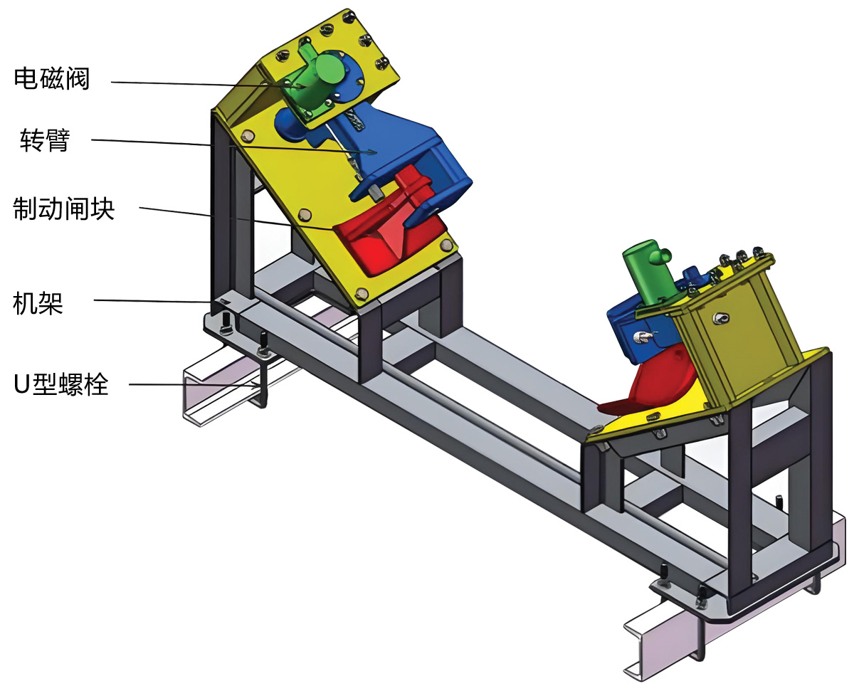 本倒断带自锁保护装置(如图 1)由主机、倒断带检测装置、电磁阀、抓捕机构等组成。抓捕机构(如图 1)由左、右对称两部分组成,断带抓捕器的结构采取凸轮压带方式,该方式的特点是体积小、结构紧凑, 抓捕皮带的拉力随着皮带下滑力的增大而增加,而且不占用用户的有效使用面积。本装置采用机电一体化设计,传感器检测灵敏度高,控制器由 PLC控制,性能稳定、工作可靠, 具有较强的抗干扰能力。