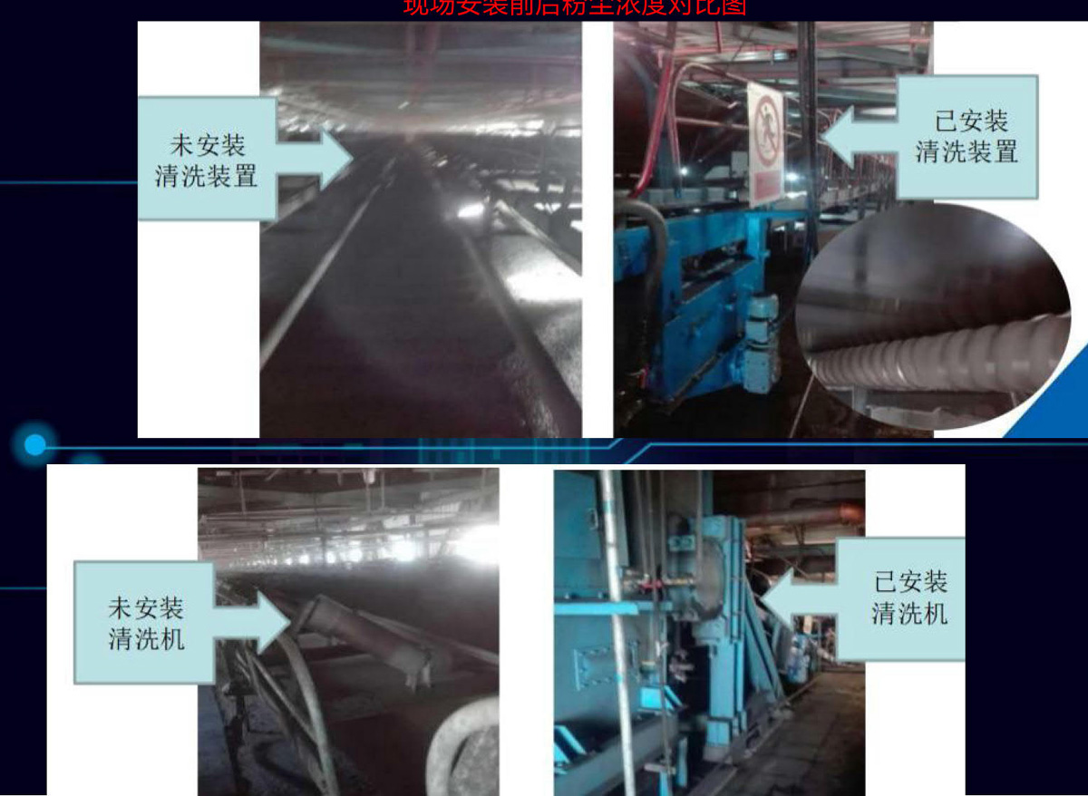 清洗机安装在回程皮带下面,靠近皮带机卸载辊筒处