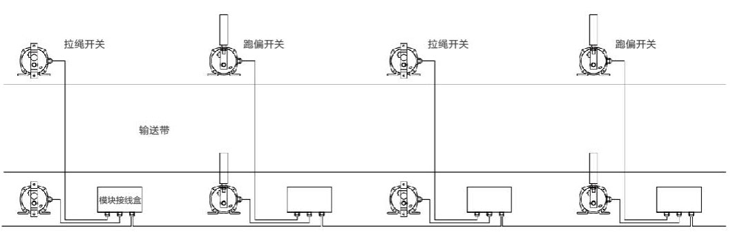 2)模块采用了最新的二合一技术,即左右侧一对拉绳或跑偏共用一个地址编码模块,提升了地址码的容量,单个主要最大可以搭载512个地址模块(1024个开关点位),同时也降低后期维护及排查故障的工作量。